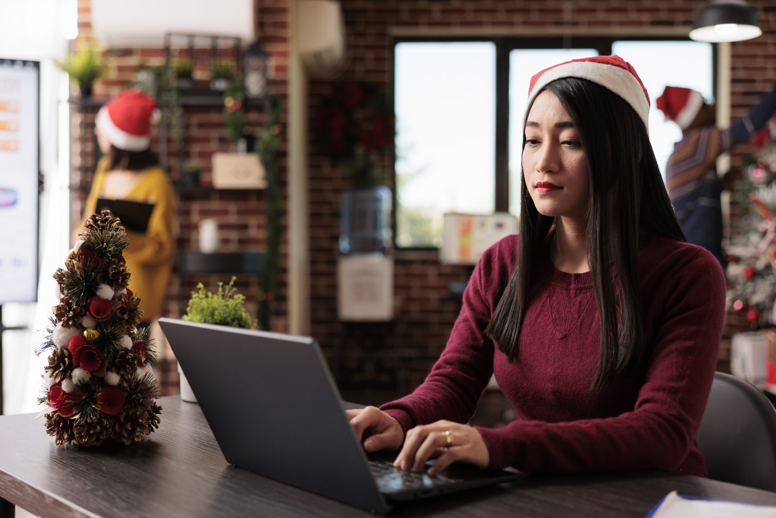 Asian woman working on laptop in christmas decorated office
